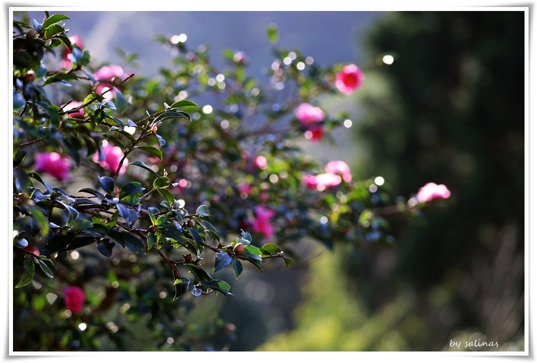 獨坐於公路邊,眺望夕陽餘暉中朵朵茶花,白花純潔,紅花絢爛似火燎原,與迎風招搖的菅芒互相輝映,蔚成溫暖的風景.
